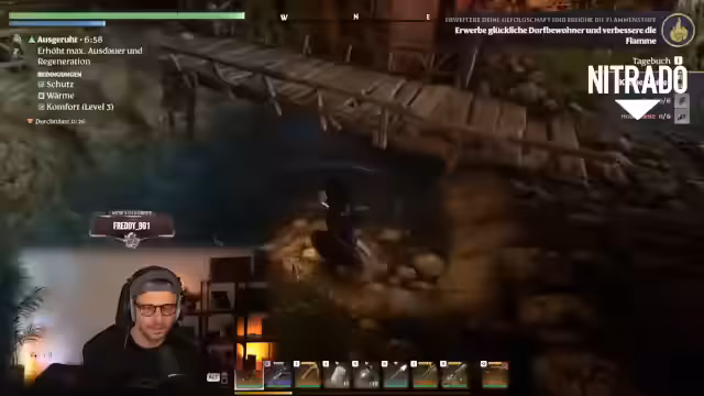 01:55:37Die Gruppe konzentriert sich auf die Hauptquestlinie und sammelt notwendige Ressourcen wie Harz, Tierfälle und Stofetzen. Sie besorgen sich auch Nahrung und trinken, um ihre Ausdauer zu regenerieren. Der Streamer zeigt verschiedene Questziele, wie die Beschaffung von Materialien für NPCs und das Bauen von Einrichtungen wie Brunnen. Er betont die Wichtigkeit des Ressourcenmanagements, da bestimmte Materialien spärlich sind und strategische Sammlung erfordern.