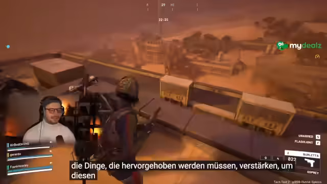 00:22:06Das Spiel bietet eine große, zusammenhängende Karte, auf der Spieler von erhöhten Positionen aus verschiedene Bereiche wie den Tower vom Spaceport oder Stationen wie Bluegate und Stellar Montes überblicken können. Bezüglich der 66 Quests wird angemerkt, dass die Belohnungen nicht immer „richtig geil“ sind. Bessere und qualitativ hochwertigere Gegenstände wurden eher bei spezifischen, schwierigeren Quests wie dem Rocketeer erhalten. Viele Quest-Belohnungen dienen eher als Mittel zum Zweck. Als besonders nützliche Funde werden Blueprints für Osprey, Halkracker-Munition und Schockminen genannt, die sehr häufig genutzt werden. Wolfpack-Blueprints sind besonders schnell im Sturm, am Damm und in Wohnsiedlungen zu finden, insbesondere in Küchen und im Power Generation Complex, wo viele metallische Boxen aufgebrochen werden können. Für ultraweiche Kissen wird die Rubin-Residenz empfohlen, sowie andere Wohngebiete, die oft durch ein kleines „Mensch ärgere dich nicht“-Figürchen gekennzeichnet sind.