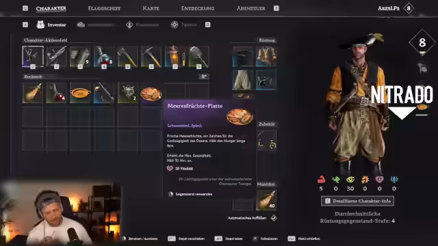 01:05:09Ein Schwerpunkt des Streams liegt auf den intensiven Schiffskämpfen und Landgefechten. Der Streamer kämpft gegen feindliche Schiffe, darunter auch Geisterschiffe, und zeigt verschiedene Strategien, wie diese bekämpft werden können. Er erwähnt die Waffenherstellung und -aufwertung, insbesondere seine Muskete, die er verbessern möchte. Ein besonderes Augenmerk liegt auf der Effektivität verschiedener Waffen gegenüber bestimmten Gegnertypen. So ist die stumpfe Waffe beispielsweise effektiver gegen stark gepanzerte Gegner als sein Rapier. Die Wichtigkeit von Buff-Nahrung und Tränken wird ebenfalls betont, um im Kampf überleben zu können.