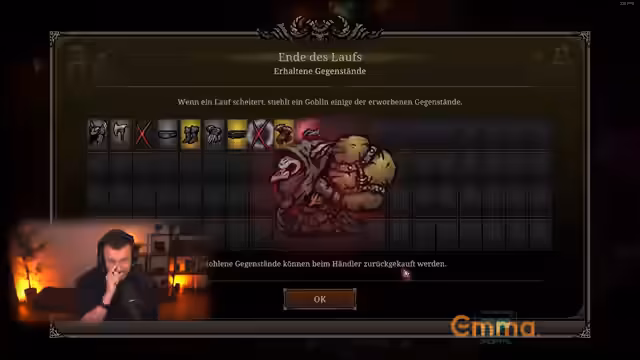 04:36:55Nach dem Bosskampf wird das Grinden fortgesetzt. Neue Gegenstände wie ein Ring, eine Brust und ein Helm mit guten Werten werden gefunden. Der Streamer wägt ab, welche Items behalten und welche verkauft werden sollen. Das System der 'gefundenen Gegenstände', die geklaut werden können, wird getestet und für gefährlich befunden.
