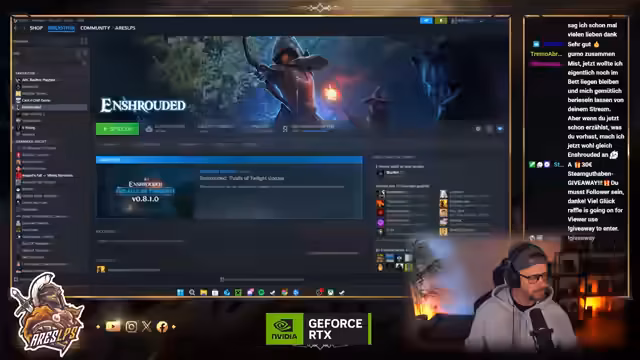 00:08:04Ares spricht über das aktuelle Spiel Enshrouded und erwähnt das große Update 6 mit dem Titel 'Thralls of Twilight'. Er erklärt, wie man auf die Ankündigungen zugreifen kann und zeigt den Trailer. Er beantwortet die Frage, ob man für das Update neu anfangen muss, mit einer klaren 'Nein'-Antwort. Er erwähnt auch die Gehaltsanpassung im positiven Sinne und dankt für die Unterstützung.
