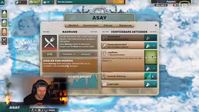 02:17:53Der Fokus liegt auf dem Aufbau und der Sicherung der Siedlung Asai. Zentrale Themen sind die knappe Ausdauer der Bewohner, die Verbesserung der Moral durch den Bau von Dienstleistungen wie Küchen, Toiletten und Tavernen sowie die ständige Sammlung von essenziellen Ressourcen wie Feuerholz und Nahrung, um den bevorstehenden Winter zu überstehen. Die Priorität liegt auf der Infrastruktur, um die Bevölkerung bei Laune und am Leben zu halten.