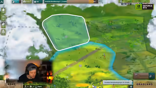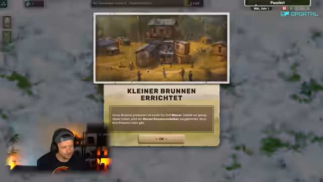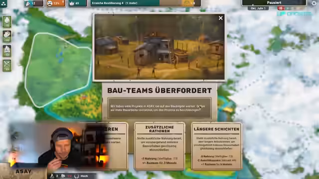 00:43:54Nach Abschluss des Tutorials beginnt das eigentliche Gameplay im Fluchtwegmodus. Der Streamer wählt einen Charaktertyp (Überlebender) und benennt seine Siedlung 'Arsai'. Der Fokus liegt nun auf dem Aufbau und der Verwaltung der wachsenden Siedlung. Dies beinhaltet das Erkunden neuer Gebiete, das Anlegen weiterer Ressourcenquellen wie Holz und Nahrung, den Bau von Gebäuden und das Management von Moral und Ausdauer der Bevölkerung.