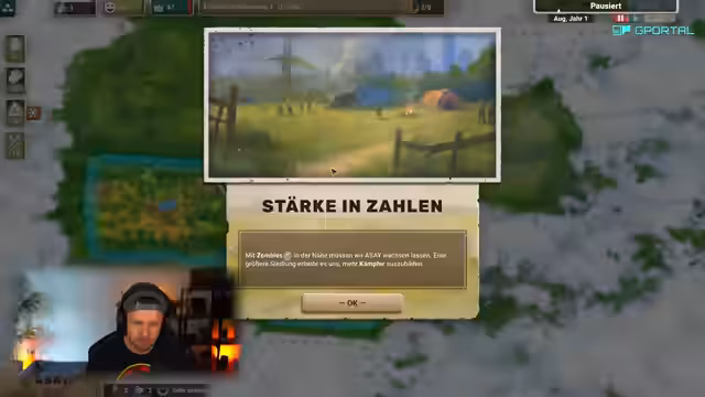 01:33:22Ein Kämpfer wird in das Zombie-Gebiet geschickt und erledigt die schlafenden Feinde erfolgreich, wobei er Schaden erleidet und sich danach in der Siedlung erholen muss. Nach der Sicherung des Gebiets werden weitere Bauprojekte wie Kaserne, Taverne und Kleinstadtplatz initiiert, um die Bevölkerungszunahme zu fördern und die Moral zu stabilisieren.