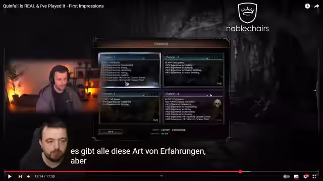 05:20:23Es wird festgestellt, dass der Preload von 'Kinfall' bereits möglich ist, das Spiel aber erst um 19 Uhr freigeschaltet wird. Der Streamer äußert die Sorge, dass die Server überlastet sein könnten. Er erwähnt das Spiel First Berserker Kazan, das ihm ebenfalls gefällt. Um einen Einblick in Kinfall zu geben, wird ein Video gezeigt, das Trailer und Gameplay-Demos enthält. Es wird ein Kinfall Channel mit einem Showcase von vor vier Monaten entdeckt, der eine Closed Beta zeigt. Der Dev Frenzy stellt das Spiel vor. Die Map rotiert und es gibt überall Wachen. Die Berufe Woodcutting, Mining, Harvesting, Fishing und Hunting werden vorgestellt, sowie die Crafting-Berufe Cooking, Alchemy, Weaponsmithing und Armorsmithing. Bei Property gibt es Husbandry und Farming. Caravan bietet Caravan Carrier, Caravan Thief, Sea Merchant und Pirate. Bei Others gibt es Treasure Hunting, Transporting und Foreman. Das maximale Level beträgt 50.