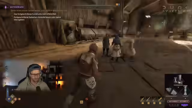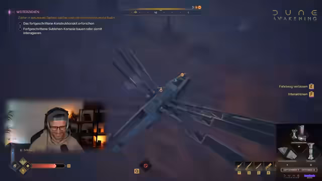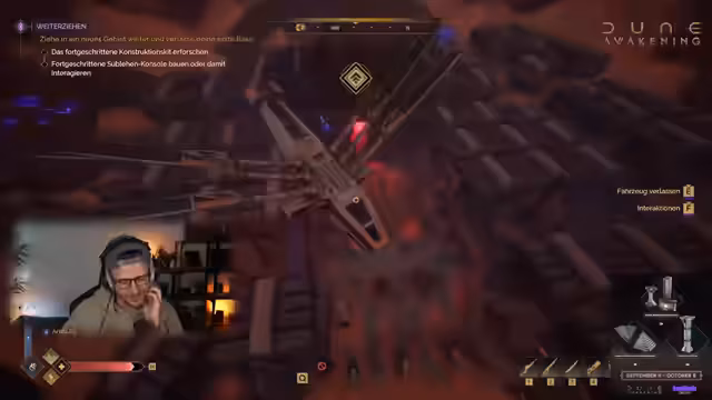 08:27:55Es wird die Rüstung und das Aussehen der Charaktere thematisiert. Die Zuschauer werden aufgefordert, die Flugzeugtechnik auszuprobieren und in Richtung Nordwesten zu fliegen, um zur Weltkarte zu gelangen. Dort sollen sie wie in einem Mass Effect 2 Minispiel nach Nordwesten zu einem Treibstofflager in der tiefen Wüste navigieren. Es wird erklärt, dass die Position, an der man die Karte erreicht, relevant ist für den Ausgangspunkt. In der Tiefen Wüste sollen sie den mittleren Balken anwählen. Die Hälfte der Tiefen Wüste ist PvE-Zone. Es wird ein A-Gebiet angeflogen. Temporäre Basen, die wöchentlich durch Stürme zerstört werden, bieten die besten Ressourcen. Die Hauptquest des Spiels wird als gut gemacht gelobt, besonders für Dune-Fans. Neue Quests und Story-Inhalte wurden erst kürzlich hinzugefügt. Es wird überlegt, ob man mit Sandbikes herumdüsen soll, aber dies würde zu lange dauern. Es wird überlegt, wie man die Flugzeuge besser zusammenhalten kann, vielleicht mit einer Leine. Die Flugzeuge werden mit E-Fuel bzw. Wasserstoff betrieben. Dune wird als eine Utopie beschrieben, wenn die FDP an der Macht wäre. Die Festungsstation im Deep Desert wird als Endgame-Bereich beschrieben, wo man die besten Sachen bekommen kann. Es wird jedoch die Sorge geäußert, dass die Mitspieler dort sterben könnten, da es sehr brutal ist. Es wird auf Fallen hingewiesen.