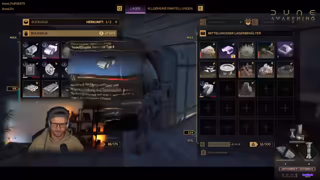 07:08:47Der Streamer zeigt einen gemeinen Skill, den Sprint, und erklärt, dass er von den Bene Gesserit stammt. Er erklärt, dass man im Spiel später alle Skilltrees bedienen kann und es eine Respec-Funktion gibt. Der Streamer scherzt über seine Flugkünste und parkt das Flugzeug im Sandsturm. Er vergewissert sich, dass alle im Flugzeug sind, und bemerkt einen visuellen Fehler bei der Anzeige der Spieler. Im Chat wird über das schwebende Gewehr gescherzt. Der Streamer wollte eigentlich das neue Fahrzeug freispielen, hatte aber keine Zeit, da er die Basis aufbauen musste. Er erzählt, dass er vor sechs Tagen fast nichts hatte und alles neu aufbauen musste. Er packt Carbon-Erz in die Box und Kay wird für einen Raid gedankt. Die Pläne in den Basen und im Social Hub können nur geleert werden. Der Streamer will die ersten Sachen hinstellen und schauen, wie viele Komponenten sie zusammenbekommen. Er fragt, ob noch Aluminium gesammelt werden soll und wird als Eingang blockiert. Der Chat fragt, ob man in der Demo alles machen kann, was bejaht wird. Der Streamer bietet an, in seinen DMs Tipps zu geben, falls Hilfe benötigt wird.