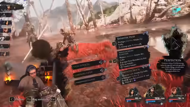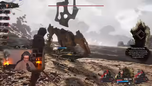 06:38:41Der Streamer kämpft gegen einen Boss, der für hohe Schaden bekannt ist und neue Waffen wie die "Potirem" getestet werden. Diese Waffen können buffen, heilen und hohen Single-Target-Schaden verursachen. Die Kämpfe sind rundenbasiert und erfordern genaues Timing für Parieren und Ausweichen, um One-Shots zu vermeiden. Es werden strategische Fähigkeiten wie "Markierung" genutzt, um den Gegner zu schwächen.