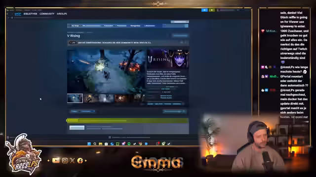 08:41:55Nachdem das V-Rising Giveaway kurzzeitig geschlossen wurde, weil die Server-Verbindung noch nicht funktionierte, wurde es wieder eröffnet und ein neuer Key für einen Gewinner namens Sacris 300 verlost. Anschließend startete der Streamer, mit Unterstützung der Community, die Einrichtung eines neuen Servers bei G-Portal. Das Ziel ist ein 50-Slot-Server, der rund um die Uhr läuft und den Spielern den Zugang zu den neuen Inhalten ermöglicht. Immer noch gab es technische Verzögerungen bei der Erstellung und dem Update des Servers.