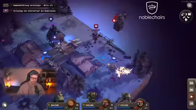 03:32:55Ein neues Spiel namens Grid and Valor 1949 wird vorgestellt. Es handelt sich um ein taktisches Roguelite im Zweiten Weltkrieg, bei dem man Einheiten mit verschiedenen Waffentypen (Feuer, Munition, Sprengung) steuert. Das Gameplay basiert auf einem Steinschere-Papier-System, bei dem sich Einheiten gegenseitig schwächen. Der Streamer absolviert ein Tutorial, bei dem er Taktiken wie Höhenvorteile und Deckung nutzt, um Angriffe abzuwehren.