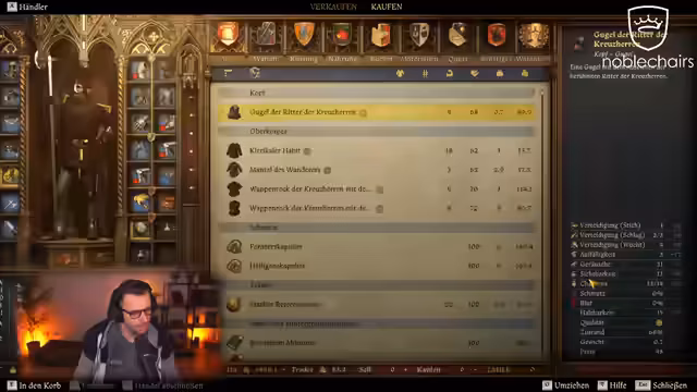 01:24:06Ein Reisender namens Gregorius wird getroffen, der mit einem ungewöhnlichen Kopfschmuck auffällt. Es folgt ein Dialog über Prophezeiungen und die Verderbtheit der Geistlichen, wobei auch fromme Menschen erwähnt werden. Gregorius bietet Waren zum Verkauf an, darunter Tränke. Anschließend wird die Ausrüstung des Charakters betrachtet, insbesondere die Ritterrüstung der Kreuzherren, wobei Vor- und Nachteile wie höhere Geräuschentwicklung und reduzierte Sichtbarkeit diskutiert werden. Es wird festgestellt, dass die Technik im Vergleich zum Vorgänger verbessert wurde, obwohl die Animationen noch kantig wirken. Verschiedene Gegenstände wie Retterschnaps, Bücher, ein geweihter Würfel, Knochenfragmente und Kleidungsstücke wie ein Wappenrock und ein Skapulier werden untersucht. Der Preis eines Gegenstands von Gregorius wird verhandelt, wobei überlegt wird, ob er für zukünftige kirchenrelevante Inhalte relevant sein könnte. Es wird erwähnt, dass das Spiel derzeit noch keine stark kirchenbezogenen Inhalte bietet, dies aber in einem DLC der Fall sein könnte. Der aktuelle Kontostand beträgt etwa 6000 Groschen, und es wird erwähnt, dass noch mehr Geld in Truhen vorhanden ist.