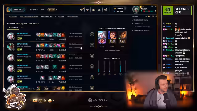 04:36:39Der Streamer reflektiert über die lange Zeit seit seinem letzten League of Legends Spiel und die anfängliche Sorge, aus der Übung zu sein. Er beschreibt die Teamzusammensetzung und die Strategie, die auf CC gegen Master Yi und Akali basiert. Es wird die Bedeutung von True Damage im Team hervorgehoben, um gegen die gegnerische Truppe effektiv zu sein. Der Streamer teilt mit, dass er seit Jahren League of Legends nicht mehr gespielt hat und das letzte Mal Aram ausprobiert hat. Er gesteht, dass er sich anfangs überfordert fühlte, aber sich schnell wieder eingewöhnt hat. Der Streamer erklärt, dass er standardmäßig um 6 Uhr morgens mit dem Streamen beginnt, heute jedoch früher angefangen hat, da er früher ins Bett gegangen ist. Er erzählt die Entstehungsgeschichte seines Streamer-Namens AresLPS, der auf seine Vorliebe für Nacktkämpfer in WoW und den Lückenfüller LPS für Let's Plays zurückgeht. Der Streamer erklärt, dass er seit Jahren in Games Ares genannt wird und dass er auch ein anderes Konzept mit Pixel-Games machen wollte, dann ist es Let's Pixels.