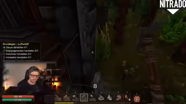 04:23:37Nach dem Sammeln weiterer Ressourcen beginnt der Streamer mit dem Bau eines Luftschiffs. Er scannt zunächst ein zerstörtes Luftschiff, um die Baupläne zu erhalten, und muss dabei den Kompass und die Herstellungsmenü-Funktion (Taste E) neu erlernen. Es folgt eine anfänglich unkoordinierte Phase, bei der er das Schiff zusammensetzt und es mit einem Energiegenerator, einem Motor und einem Ballon ausgestattet. Nach anfänglichen Schwierigkeiten beim Starten und Steuern kann er das Schiff erfolgreich starten und in die Luft bringen.