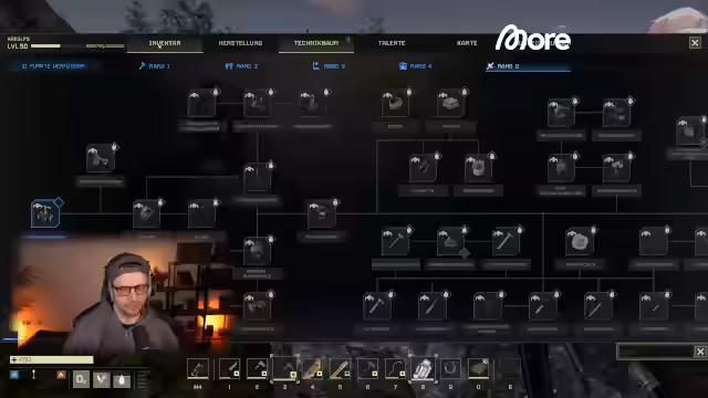 02:10:16Die Erkundung der Spielwelt steht im Fokus, wobei nach Höhleneingängen gesucht wird. Es wird festgestellt, dass es Höhlen auch unter Wasser gibt. Nach erfolgreicher Jagd auf Büffel und Hirsche werden deren Felle und Leder benötigt, um ein rustikales Bett herzustellen. Das Gameplay beinhaltet neben dem Bau auch das Leveln der Figur, das Freischalten von Technologie-Bauplänen und das Verteilen von Skillpunkten in einer Raumstation. Ein Ziel ist es, mit besserer Ausrüstung in gefährlictere Gebiete vorzustoßen, ohne zu verbrennen oder zu ersticken.