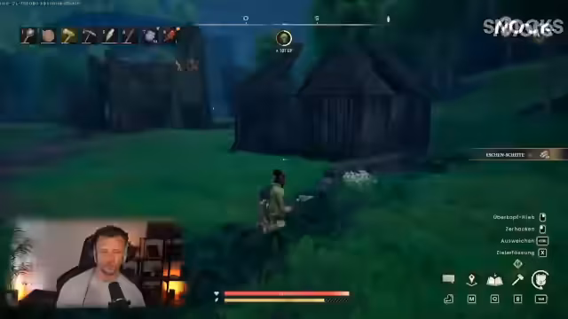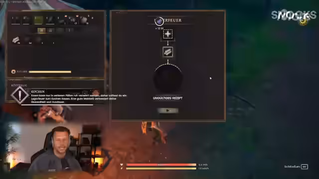 05:00:29Zuerst wird das Grundprinzip des Sammlens und Herstellens erläutert, beginnend mit Beeren, die eigentlich Samen sind. Der Streamer sammelt Ressourcen, kocht Nahrung, was Level-Ups im Kochen-Skill bringt und einen Pfannenhalter freischaltet. Dies wird als sehr nützlich für den weiteren Spielverlauf angesehen. Zudem wird die Entdeckung eines neuen Magie-Systems vorgestellt, das auf Runen basiert. Besonders hervorgehoben wird der Effekt, der beim Fällen von Bäumen mit Holzsammelzaubern entsteht, der das Holz automatisch in Kleinholz zerlegt und das Sammeln massiv beschleunigt.