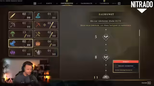 06:07:28Ein zentraler Punkt ist das Runenfertigungs-System, bei dem man Runen-Essenz in Runen umwandelt. Dieser erweiterte Magie-Mechanismus ermöglicht es dem Spieler, nicht nur zu zaubern, sondern auch Ressourcen wie Holz durch eine 'Detonation'-Zauberformel effizienter abzubauen. Dies wird als entscheidende Quality-of-Life-Verbesserung dargestellt, die den Spielfluss beschleunigt. Außerdem wird der Bogen-Skill weiterentwickelt und erste Magie-Level erreicht, wobei ein Naturstab erworben wird, um Feuermagie als Sekundärangriff einzusetzen.
