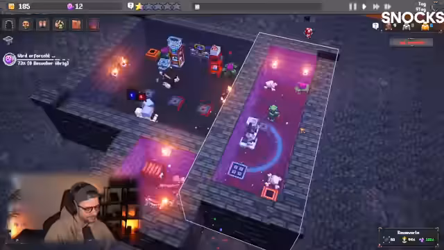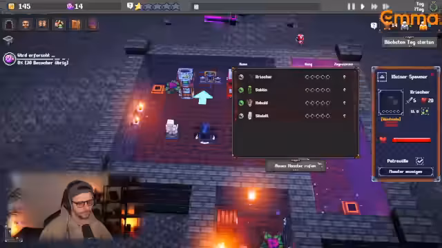 01:59:18Als drittes Spiel stellt der Streamer Dungeon Tycoon vor, ein Tycoon-Spiel, in dem der Spieler einen Dungeon baut und Abenteurer lockt. Er startet ein Tutorial, baute zuerst eine Tür und einen Monster-Spawner und installierte Fackeln, um die Zufriedenheit der Besucher zu erhöhen. Die ersten Helden sterben prompt, was zu negativer Resonanz und dem Verlust von Seele führt, die man für Upgrades nutzen kann.