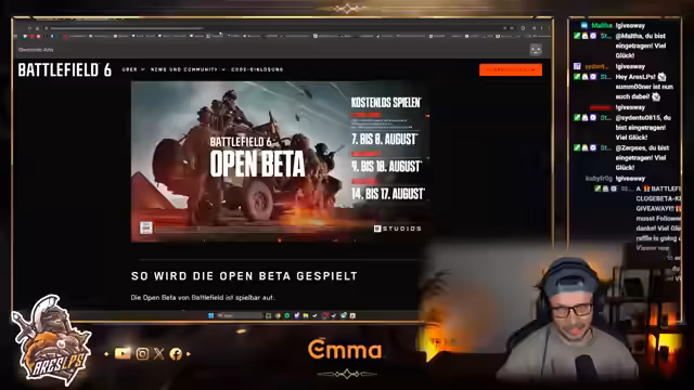 06:02:37Zu Beginn des Streams gab es eine längere Diskussion über die Battlefield 6 Beta. Es wurde klargestellt, dass der Early Access für den 7. bis 8. August geplant ist, der Preload jedoch erst am 4. August beginnt. Viele Zuschauer berichteten von Problemen beim Einlösen ihrer Beta-Codes, die sie über Twitch-Drops erhalten hatten. Der Streamer erklärte, dass die Codes oft fälschlicherweise als bereits eingelöst angezeigt werden, obwohl sie erst ab dem 7. August funktionieren werden. Zusätzlich wurden die Daten der offenen Beta-Wochenenden vorgestellt: der 9. bis 10. und der 14. bis 17. August, für die keine Codes benötigt werden.