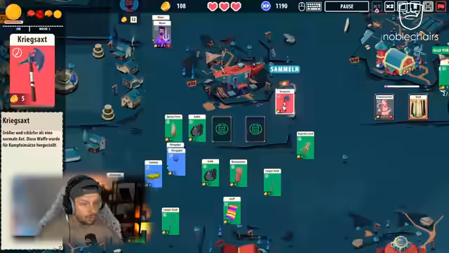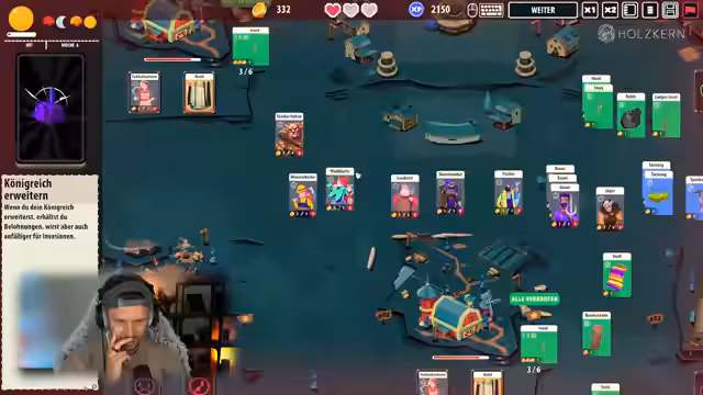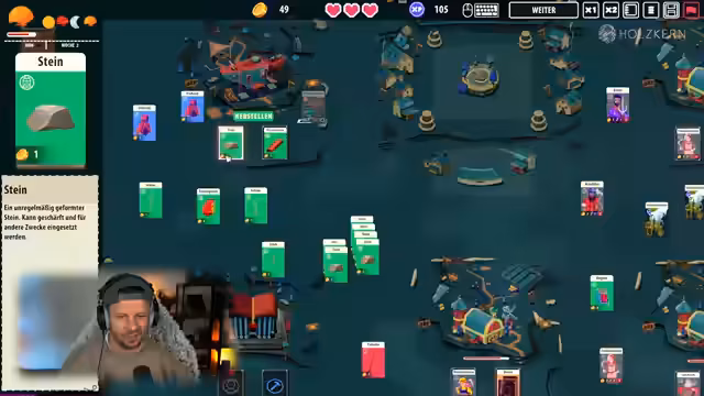 01:03:27Nach Minishoot Adventures stellt der Streamer 'Kingdom of Cards' vor, ein Strategiespiel, das sich von herkömmlichen Kartenspielen durch sein Crafting-System unterscheidet. Das Ziel ist, ein Königreich aufzubauen, indem Karten kombiniert werden, um neue Gegenstände, Waffen und Werkzeuge herzustellen und Ressourcen zu sammeln. Im Gameplay werden Gebäude wie 'Burgland' errichtet und Einheiten wie 'Bauer' eingesetzt, die Ressourcen sammeln oder zu kampffähigen Einheiten wie 'Soldat' weiterverarbeitet werden können.