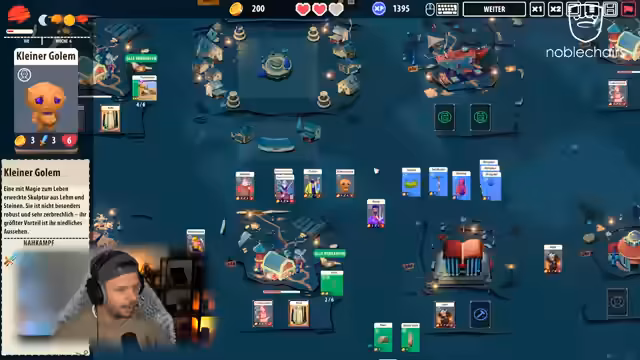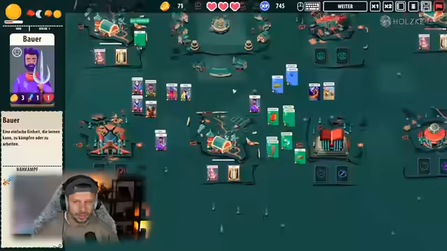 02:52:11Ein zentrales Thema ist das Crafting von Einheiten durch die Kombination von Ressourcen. Aus einem Bauer und einer Axt entsteht ein Holzfäller, aus Stock und Stein ein Dolch. Es wird gezeigt, wie der Streamer Ressourcen wie Stöcke und Steine sammelt, verkauft und mit dem Gold neue Karten und Einheiten im Shop kauft. Das Management der Ressourcen steht im Vordergrund, um effizientere Einheiten wie Minenarbeiter und Feldarbeiterinnen zu erschaffen und die Quests zu erfüllen.