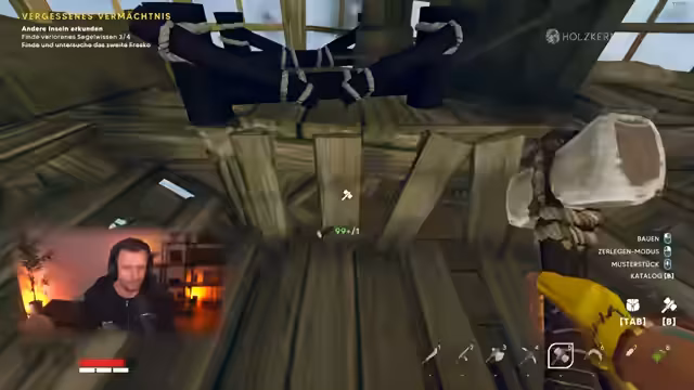 02:22:30Um ca. 8550 Sekunden startet der Streamer das Spiel Aloft. Er beginnt mit dem Sammeln von Basisrohstoffen wie Holz und Stein, aus denen er mithilfe von Blaupausen einfache Werkzeuge wie einen Hammer herstellt. Er erklärt den Kernmechanismus des Spiels: den Aufbau und das Verbinden von schwebenden Inseln zu einem Schiff. Nachdem er einen ersten Gleiter gebaut hat, erkundet er die Umgebung, untersucht fehlende Fresken und sammelt Ressourcen, wobei er auch das Umfeld wie kranke Inseln und deren Heilung erwähnt.