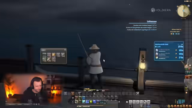 00:06:50Der Stream beginnt mit Begrüßungen der Zuschauer. Ares spielt Final Fantasy XIV und nutzt den Start, um das Spiel-Interface und die Menüs zu erklären. Es geht zunächst um das Angeln im Spiel. Der Streamer wählt den Beruf des Fischers aus, muss aber feststellen, dass er sich bei der Suche nach Dolchfischen vertan hat und sich an der falschen Angelstelle befindet. Dies führt zu ersten technischen Erklärungen des Spiel-Systems.
