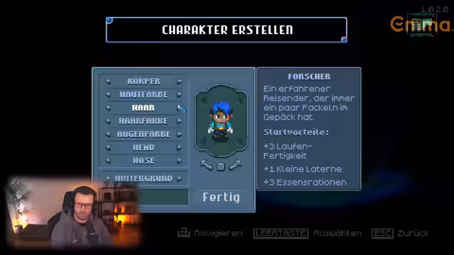 05:26:36Nach erfolgreicher Server-Erstellung betritt der Streamer das Spiel und beginnt, seine Spielfigur zu erstellen. Er wählt den Klassen-Beruf 'Kämpfer' und stellt die Haarfarbe auf braun ein. Die Geschichte beginnt mit der Landung in einer seltsamen Welt. Die ersten Schritte konzentrieren sich auf das Überleben: das Sammeln von Holz, das Herstellen von Fackeln, Werkbänken und einer Holzhacke. Er equippt sich mit einer Holzrüstung und sammelt erste Nahrung wie Pilze und Herzbeeren.