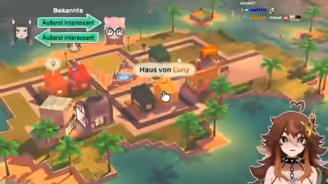 00:20:34Nachdem 'Lally' zur Insel hinzugefügt wurde, lernt sie die anderen Bewohner kennen. Es zeigt sich schnell, dass sowohl Lally als auch Ginger sich in denselben Charakter verlieben könnten, was zu komplexen Dreiecksbeziehungen führt. Asche organisiert Treffen zwischen den Charakteren und versucht, deren Zufriedenheit durch Geschenke und Einrichtungsgegenstände zu erhöhen, während sie gleichzeitig die Inselinfrastruktur verbessert, indem sie Straßen und andere Einrichtungsgegenstände hinzufügt.