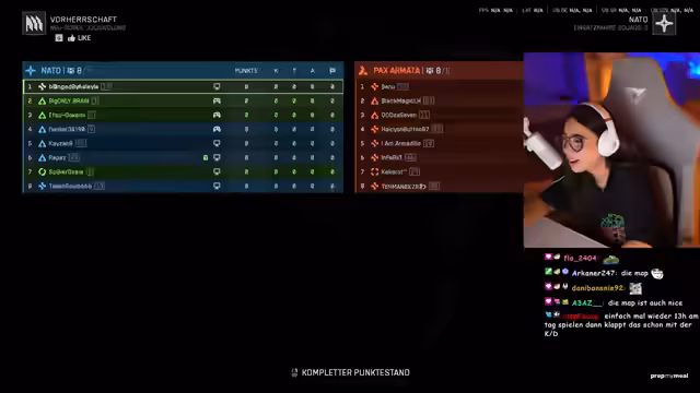 01:54:08Nach einem erfolgreichen Raid und einem gefühlten 29er-Hit gerät Asleyia in Aufregung, als sein AIM-Board glitcht und er technische Probleme vermutet. Er wird nervös und schreit wiederholt, insbesondere durch die Anwesenheit von Chris und Reapers. Während er versucht, sich mit neuen Waffen wie der NVO (besserer Recoil) zu fokussieren, reflektiert er über seine Performance und den Einfluss seiner Teammitglieder auf die Gegnerstärke.