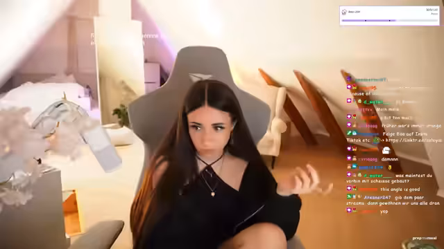 00:00:03Die Streamerin ist mit ihrer neuen Kameraperspektive, die direkt von vorne zeigt, sehr unbeholfen und nervös. Sie ist es nicht gewohnt, und das Verarbeiten ihres eigenen Bildes aus diesem Winkel fällt ihr extrem schwer. Sie bittet das Publikum um ehrliches Feedback, ob diese Perspektive zu sein oder ob es besser wäre, wieder zur seitlichen Ansicht zurückzukehren. Sie erwähnt auch, dass es sich ungewohnt anfühlt, da sie es als unpersönlich und "von oben herab" empfindet, was sie in den IRL-Streams als angenehmeren, persönlichen Kontakt zu den Zuschauern empfindet.