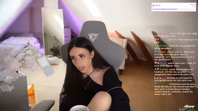 01:08:22Die Streamerin spricht über ihre große Prüderie und ihr Unbehagen mit Nacktheit, sowohl bei sich selbst als auch bei anderen. Sie betont, dass sie es nie in eine Sauna geschafft hat und sich unwohl fühlen würde, wenn ihr Partner nackt in einem öffentlichen FKB-Bereich wäre. Sie sieht Kleidung als gesellschaftliche Norm an und kritisiert, dass im Sport oft unfreiwillig bestimmte Kleidung getragen werden muss. Sie bevorzugt für sich selbst eher bedeckte Outfits wie Tankinis mit längerer Hose.