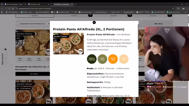 05:33:49Die Streamerin bewirbt aktiv ihren Partner PrepMyMeal, einen Lieferdienst für gesunde, vorgeportionierte Mahlzeiten. Sie erklärt die Vorteile: einfache Zubereitung, klare Kalorien- und Nährwertangaben, hoher Proteinanteil für Sättigung und Muskelaufbau. Als spezielles Beispiel nennt sie das Alfredo Chicken-Gericht. Für die Zuschauer gibt es einen 5%-Rabatt mit dem Code 'Aslea'. Sie betont, dass dies ihre Lieblingspartnerschaft ist und nutzt die Gelegenheit, um Nachschub für ihre WoW-Challenge anzufordern.
