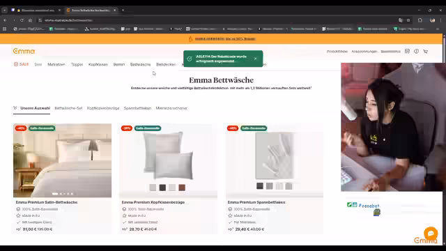 01:56:29Der Streamer stellt seine neue Partnerschaft mit Emma Matratzen vor und zeigt ein Sci-Fi-Kissen der Marke. Er erklärt, monatelang versucht zu haben, mit Emma zusammenzuarbeiten, da er eine qualitativ hochwertige Matratze benötigt. Nachdem ihm Matratze, Decke und Kissen zugesendet wurden, bestätigt er die gute Schlafqualität. Auf der Webseite von Emma findet man Matratzen in verschiedenen Preiskategorien, Topper, Kopfkissen, Bettwäsche und Betten. Mit dem Code 'Aslea' gibt es 5% Rabatt.
