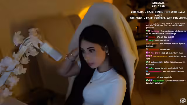 00:54:32Die Streamerin gibt an, dass sie in wenigen Tagen zu einem Red Bull Event nach Hamburg eingeladen ist und sich darüber sehr nervös zeigt. Sie muss dort in kurzen Hosen teilnehmen, was sie aufgrund ihrer Figur sehr unwohl fühlen lässt. Sie erwähnt, dass sie für solch öffentliche Anläufe eine spezielle Vorbereitungstechnik hat: Sie spricht eine halbe Stunde vor dem Event mit sich selbst im Spiegel und gibt sich selbstbestätigende Parolen, um Selbstvertrauen zu tanken und die Nervosität zu überwinden.