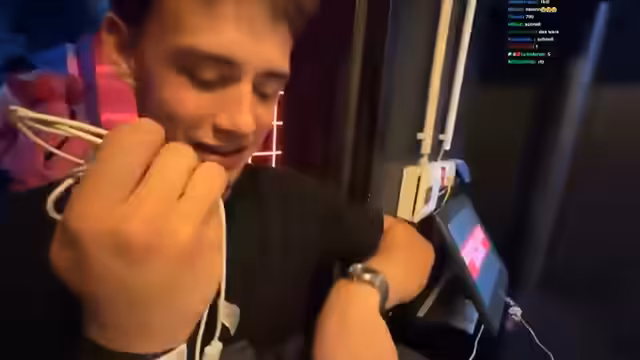 02:03:01Ein kritischer Moment tritt ein, als der Akku des Streaming-Geräts auf 0% sinkt. Der Streamer und sein Kameramann Theo sind in großer Eile, um eine Powerbank zu finden und den Stream am Laufen zu halten. Es herrscht eine aufgeregte Suche nach dem Rucksack und dem Kabel. Nachdem sie den Akku retten können, feiern sie im Chat den Erfolg 'W, Vene, W' und erkennen die Hilfe der Zuschauer an.