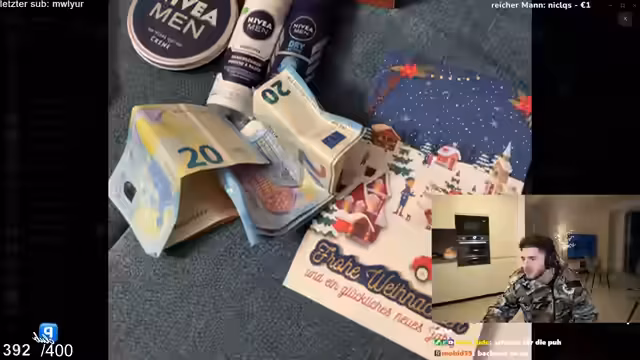00:41:45Im Finale werden extreme Luxusgeschenke gezeigt, darunter ein Louis Vuitton Portemonnaie, Timberlands, ein Macbook, AirPods Max, Designerparfüms, Festival-Tickets, Supreme Box Logos und teure Schmuckstücke. Besonders erwähnenswert ist ein Zuschauer, der 5.000 Euro von seiner Oma, einen E-Roller und Designerkleidung erhielt. Ein anderer bekam sogar einen R8 oder einen Patek Philippe. Der Streamer ist fasziniert, aber kritisiert teils die sinnlose Konsumgesellschaft.
