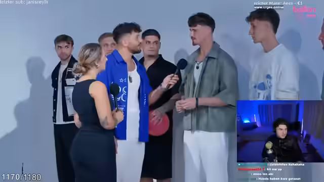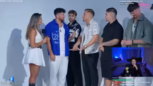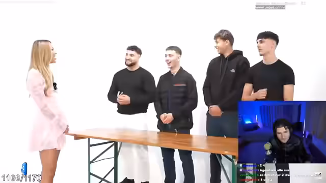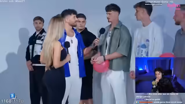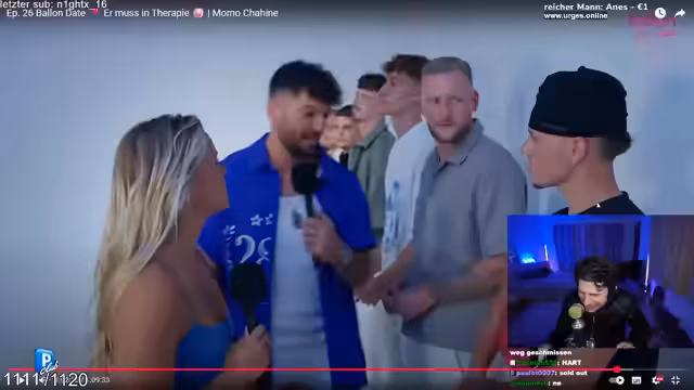 01:00:06Der Streamer startet eine Live-Dating-Show, genannt 'Pumping Monkey'. Er kommentiert ein Video, in dem 10 Männer eine Frau daten sollen, aber nur zwei es ernst meinen. Er moderiert den Stream mit einer Co-Moderatorin namens Amalia. Die erste Kandidatin, Lilo aus Münster, tritt auf und es wird Smalltalk mit dem ersten der zehn Männer, Jordan, betrieben. Der Streamer hat keine hohen Erwartungen an das Video und scheint eher unterhalten zu sein. Die Interaktion ist unangenehm und ein Zuschasser schlägt eine Kanalwette vor, ob die Kandidatin überhaupt mit Jordan reden würde, wenn er nicht berühmt wäre.