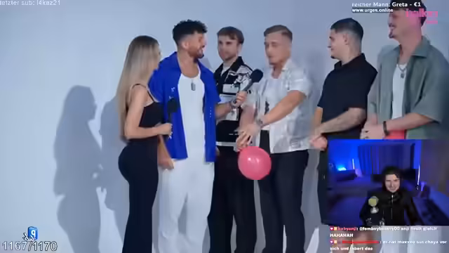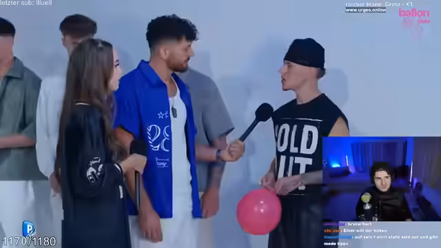 02:49:02Die verbleibenden vier Männer, Georg, Ilan, Kilian und Phil, stellen sich Mette vor. Mette muss nun einen von ihnen eliminieren. Der Streamer gibt den Tipp, dass sich die Entscheidung oft an oberflächlichen Details wie Aussehen oder Sympathie orientiert. Nach der Vorstellung der vier Männer fordert der Streamer Mette auf, eine Entscheidung zu treffen und einen Ballon platzen zu lassen, um ihren Favoriten zu eliminieren.