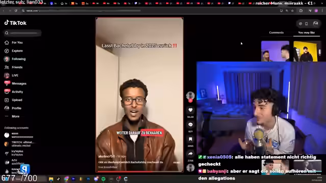 00:47:30Im Stream wird ein Video von Bachelor Baby thematisiert, das 86.000 Likes erreicht hat. Der Sprecher kritisiert, dass ein Mann einen anderen Mann für eine nicht nachvollziehbare Sache öffentlich runtermacht. Er betont, dass solche Vorwürfe auch jedem anderen passieren könnten und dass finanzieller Erfolg nicht vor Kritik schützt. Die Situation wird als unverhältnismäßig dargestellt, besonders weil es um intime Themen geht, die im Internet ausgetragen werden. Der Sprecher merkt an, dass er selbst nicht nach Viralität strebt, sondern seinen Chat als direkte Gemeinschaft sieht, die nicht mit der TikTok-Öffentlichkeit gleichzusetzen ist.