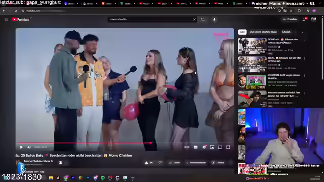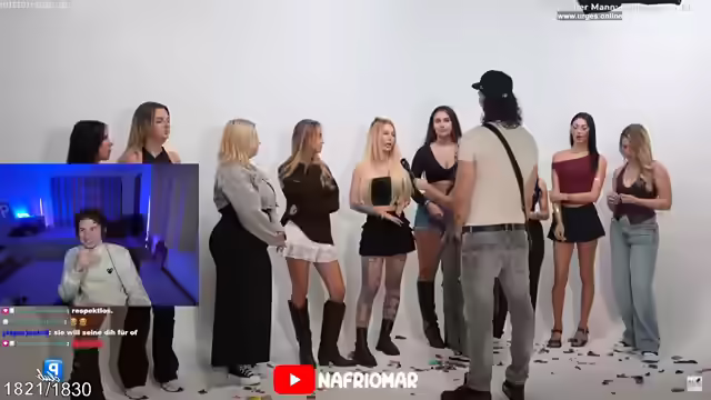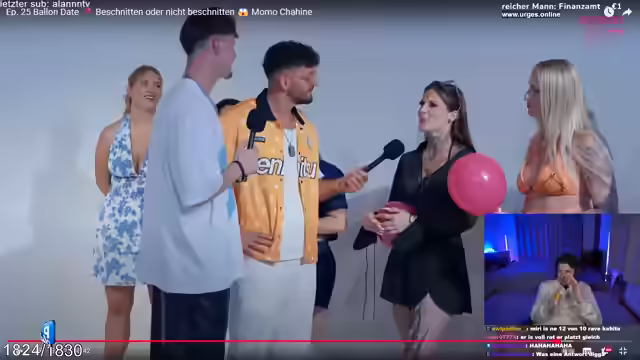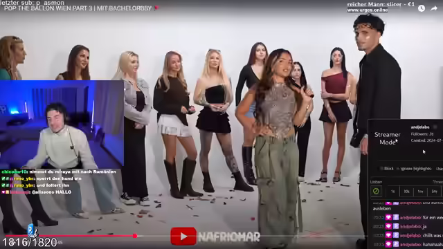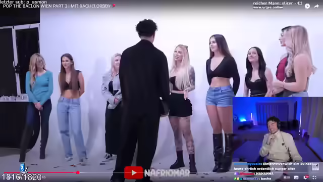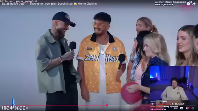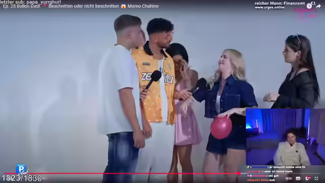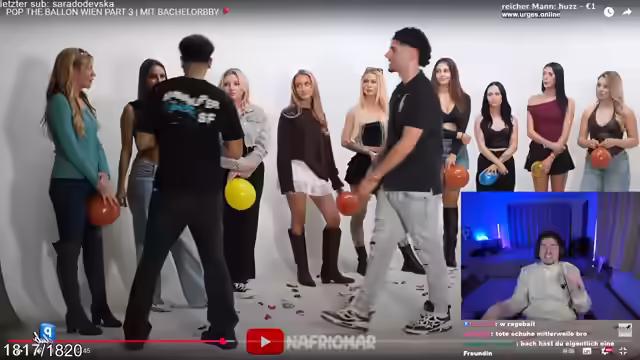 02:42:58Es wird sich gefragt, ob Momo mal wieder ein Video gedroppt hat und ein Umfrage-Video auf dem For You-Feed gezeigt. Es wird beschlossen, Momo Chahine zu gucken, da er als Content gilt. Es wird über Schönheitsideale diskutiert, wie z.B. eine große Nase oder dünne Beine. Es wird erwähnt, dass es die Möglichkeit gibt, noch einen Ballon zu nehmen. Anschließend werden die Kandidatinnen von 'Long Dead' vorgestellt, darunter eine Lebensberaterin, was als dümmster Job überhaupt bezeichnet wird. Es werden verschiedene Berufe genannt, darunter Mediengestalterin und eine Kandidatin, die aus dem KitKat-Club kommt. Eine Onlyfans-Darstellerin wird vorgestellt, wobei ihr Piercing als hässlichstes Merkmal bezeichnet wird. Momo begrüßt die Zuschauer und bittet um Abonnements, Likes und Kommentare. Er erklärt die Regeln des Spiels, bei dem die Kandidatinnen einen Mann platzen lassen können, wenn er ihnen nicht gefällt.