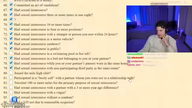 04:03:53Es wird ein 'Rice Purity Test' gespielt, bei dem angekreuzt wird, welche Erfahrungen man gemacht hat, um am Ende einen 'Freaky'-Score zu erhalten. Es werden Fragen zu Beziehungen, Küssen, Sex, Pornos, Drogen und kriminellen Aktivitäten beantwortet. Es wird offen über sexuelle Erfahrungen, Alkoholkonsum und den Umgang mit Drogen gesprochen. Der Streamer gibt zu, einige riskante Verhaltensweisen in der Vergangenheit gehabt zu haben, betont aber, dass er heute vorsichtiger ist. Er äußert sich zu Themen wie Voyeurismus, Inzest und Bestialität und distanziert sich klar von diesen. Am Ende des Tests wird ein Score von 21 erreicht, was als Zeichen für viele Erfahrungen interpretiert wird. Der Streamer versucht, seinen alten Rice Purity Test zu finden, um die Ergebnisse zu vergleichen, was sich jedoch als schwierig erweist. Es wird überlegt, ob das Video auf dem Zweitkanal hochgeladen werden soll, und der Streamer betont, dass er den Test irgendwann noch einmal machen möchte, um zu sehen, wie sich sein Score verändert hat.