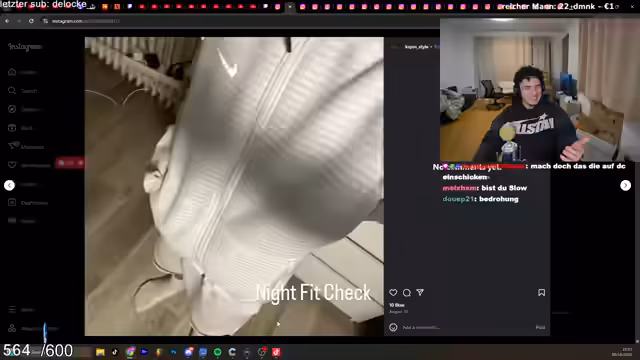 01:01:37Es wird ein YouTube-Video zum Thema Instagram-Profil-Bewertung geben. Der Gewinner des heutigen Wettbewerbs, dessen Profil als das 'toughste' bewertet wird, erhält ein Geschenk aus dem Kleiderschrank. Die Teilnahme erfolgt, indem man das letzte Bild auf dem Instagram-Profil des Streamers liked und einen Kommentar wie ein 'Pee'-Emoji oder ein Feuer-Emoji hinterlässt. Die neuesten Kommentare werden berücksichtigt, und es werden immer zehn Accounts geöffnet. Ziel ist es, die 'toughesten' oder 'okaysten' Profile zu bewerten, ohne zu viele Tipps zu geben. Profile ohne Posts können nicht gewinnen, da sie nicht als 'tough' gelten. Der Streamer bittet die Zuschauer, keine Jacken mehr einzusenden, da er sich auf die Instagram-Bewertungen konzentrieren möchte.