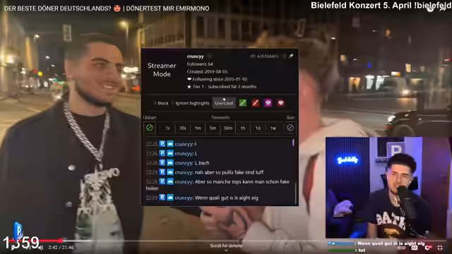 02:42:50Gemeinsam mit seinem Freund Emil besucht der Streamer den Dönerladen "Kulti Kebab". Während des Wartens in der Schlange sprechen sie über verschiedene Themen. Emil hat dem Streamer ein Poster geschenkt, was dieser jedoch als zu qualitativ schlecht und unpassend für den Stream empfindet. Es folgt eine Debatte über das Tragen von Original- und Fakes-Kleidung, bei der der Streamer seine Meinung vertritt, dass Fakes peinlich sind und keine echte Qualität ausstrahlen, im Gegensatz zuSecondhand-Originalstücken.