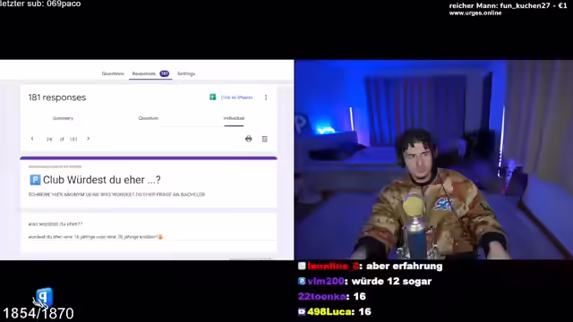 00:07:11Es wird angekündigt, dass im heutigen Stream Snap Chayas angerufen werden sollen. Der Streamer erklärt, dass er sehen möchte, wie das funktioniert und ob es gut ankommt. Zudem sollen die Zuschauer "Würdest du eher"-Fragen stellen, die er dann beantworten wird. Er hat bereits 100 Fragen erhalten und bittet die Zuschauer, über einen Link im Chat weitere Fragen einzureichen. Er erklärt die Regeln für die Beantwortung der Fragen: Er hat drei Joker, um unangemessene Fragen (z.B. solche, die sich auf Familie oder sexuelle Handlungen beziehen) nicht beantworten zu müssen. Wenn er eine Frage nicht beantworten möchte und keinen Joker einsetzen will, muss er einen Shot trinken. Der Link für die Fragen wird im Chat geteilt und soll von den Mods angepinnt werden.