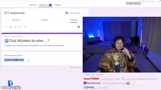 01:36:26Der Streamer setzt die Beantwortung der 'Würdest du eher' Fragen fort, wobei er eine breite Palette an Themen abdeckt. Es geht um geografische Vorlieben ('Ein Jahr in Indien oder Bangladesch leben?'), berufliche Entscheidungen ('Nie wieder Musik machen oder eigene Klamottenmarke haben?'), und moralische Fragen ('In Vergangenheit etwas ändern oder Zukunft beeinflussen?'). Es folgen sehr persönliche und teils provokante Fragen, die sexuelle Präferenzen und Neigungen berühren ('Mit 15 eine 12-Jährige daten oder mit 20 eine 15-Jährige?'). Der Streamer äußert mehrfach sein Unbehagen über den Inhalt der Fragen, beantwortet sie aber dennoch, oft mit humorvollen oder ironischen Kommentaren. Es werden auch Fragen zu Schönheitsidealen ('Glatte Haare oder langer Zopf?') und Karrierewegen ('9 to 5 Job oder Scammer sein?') behandelt. Einige Fragen sind so absurd und eklig ('Rainbow Kiss mit El Theodor oder Celia?'), dass der Streamer Mühe hat, eine Antwort zu finden. Trotz des teilweise fragwürdigen Inhalts setzt er das Format fort, wobei er immer wieder betont, wie unsinnig und übertrieben die Fragen sind.