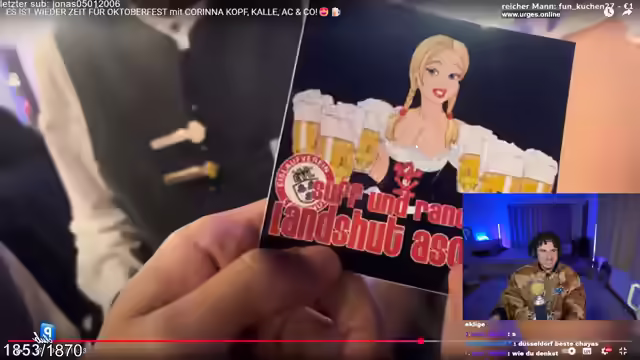 02:08:51Es beginnt mit der Erwähnung von Sidney, Corinna Kopf und dem Oktoberfest, wobei der Streamer bedauert, nicht anwesend gewesen zu sein. Er räumt ein, dass er das Startdatum des Oktoberfests nicht kannte. Es folgen Überlegungen zum eigenen Outfit für das Oktoberfest, wobei eine Lederhose aus einer Playboy-Collab ins Spiel gebracht wird. Der Preis dieser Lederhose wird online recherchiert und mit etwa 2.000 Euro angegeben, wobei die limitierte Verfügbarkeit von nur 30 Stück überrascht. Der Streamer äußert seine Begeisterung für die ausgelassene Stimmung auf dem Oktoberfest, wo alle draußen Bier trinken. Er fragt sich, ob Sidney und Corinna etwas miteinander haben, und bemerkt die Aufregung und das Verhalten anderer Personen. Er selbst fühlt sich bereits leicht angetrunken, obwohl er noch nichts gegessen hat, freut sich aber auf den Besuch der Ochsenbraterei. Das Oktoberfest wird als 'Titten Event' bezeichnet, und die Dirndl-Magie wird hervorgehoben, die normale Mädchen in 'Geistesgestörte' verwandelt. Es wird gefordert, Dirndl zur Pflichtkleidung zu machen, aber auch diskutiert, ob dies die Einschätzung echter 'Tiddies' erschweren würde. Die Regeln bezüglich der Schleife am Dirndl (Single, vergeben, willig) werden angesprochen, aber der Streamer gibt zu, sie vergessen zu haben. Abschließend wird betont, dass ein Besuch des Oktoberfests sich nur wegen der Frauen lohnen würde, ohne sich dem exzessiven Alkoholkonsum hinzugeben.