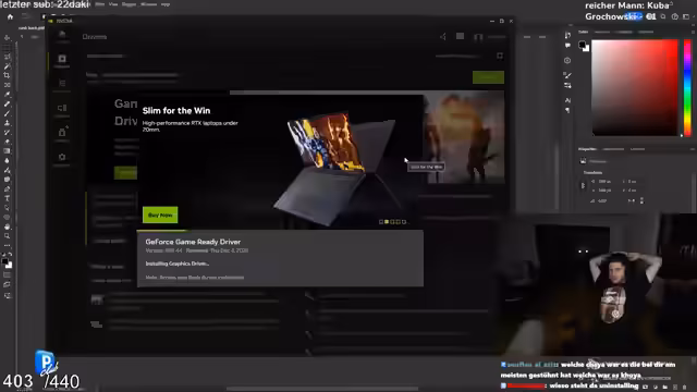 05:55:20Während des Streams treten technische Probleme auf. Der Streamer bemerkt, dass sein PC langsam läuft und vermutet, dass sein alter Grafiktreiber die Ursache ist. Er beginnt mit einem Update für seinen NVIDIA-Grafiktreiber, was den Stream vorübergehend unterbricht, um eine bessere Performance für zukünftige Aktivitäten zu gewährleisten.