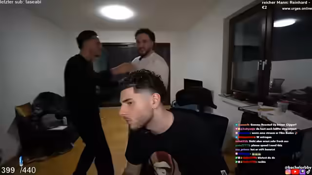 00:00:00Zu Beginn des Streams begrüßt der Streamer, bekannt als Bachelorbby, sein Publikum und stellt Hood Barber vor, einen Friseur, den er von TikTok kennt. Gemeinsam planen sie einen Haarschnitt, da der Streamer am nächsten Tag nach Rumänien fliegt und sich frisch präsentieren möchte. Hood Barber trägt eine Schürze mit seinem Logo, und die Atmosphäre ist locker und unterhaltsam. Der Streamer äußert, dass er selbst auch Haare schneiden kann, möchte aber heute die professionelle Hilfe nutzen und lässt Hood Barber bereits seinen eigenen Stil bewerten.