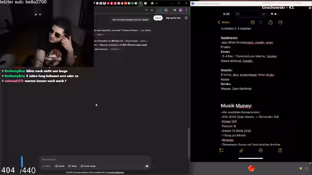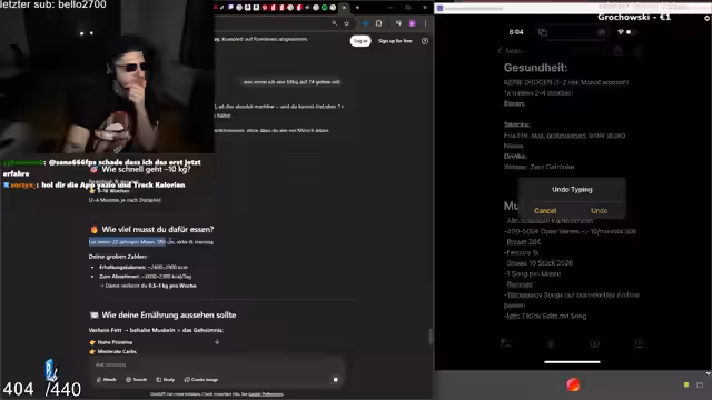 04:00:07Der Streamer gibt einen Überblick über seine geänderten Gewohnheiten für die Gesundheit. Er erwähnt, dass er wegen der langen Stream-Zeiten Zigaretten rauchen könnte, es aber vermeiden wird. Er kritisiert unrealistische Ernährungsempfehlungen aus dem Chat und betont, dass sein Plan auf Basis von 2000 Kalorien und 180 Gramm Protein realistischer sei.