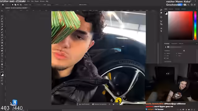 00:03:33Ein Hauptaugenmerk liegt auf der Gestaltung des Artworks für ein sogenanntes 'Cash Badge'. Der Streamer experimentiert intensiv mit Bildbearbeitung, insbesondere an einem Selfie, um das Bild an einen gewünschten Stil anzupassen. Es werden Farbkorrekturen, Helligkeitsanpassungen und Effekte wie künstliche Veredelung mit der AI-App 'Remini' getestet, um eine ansprechende 'tough' und stylische Optik für das zu erstellende Bild zu erzielen.